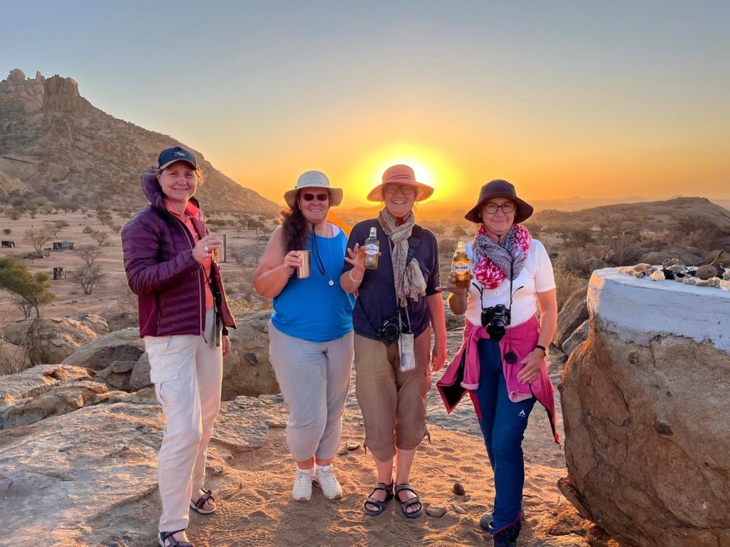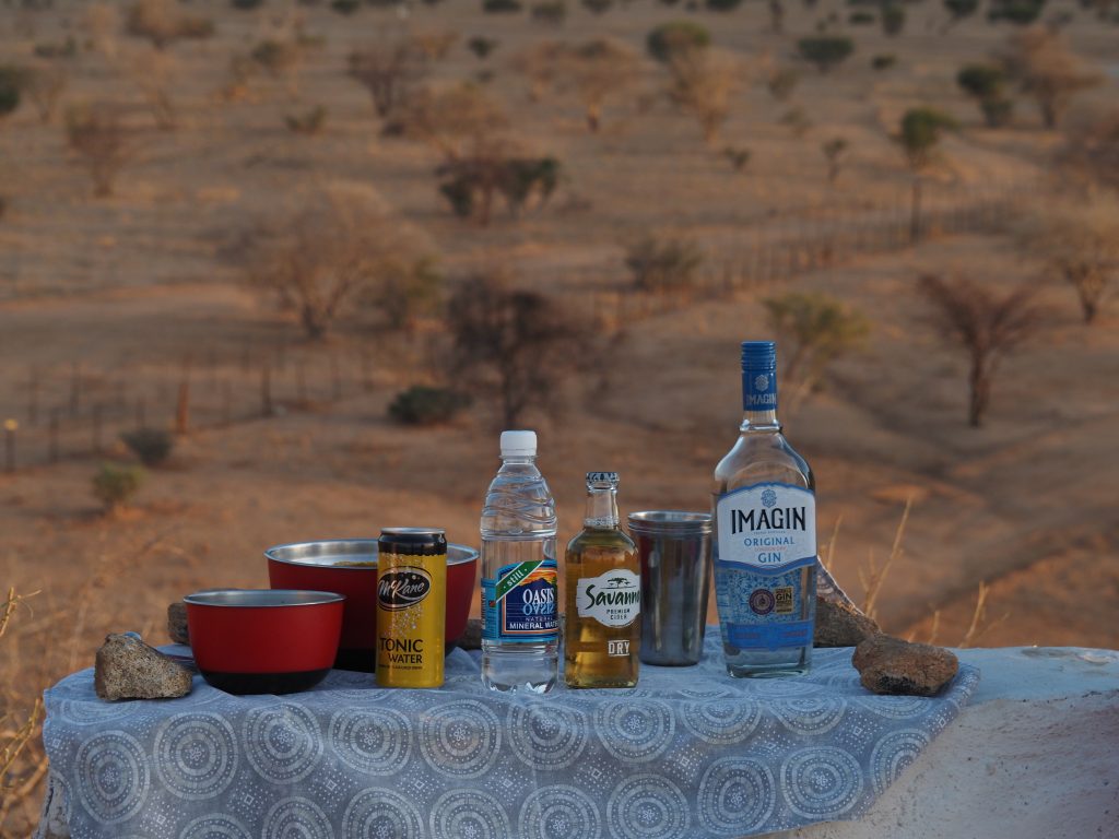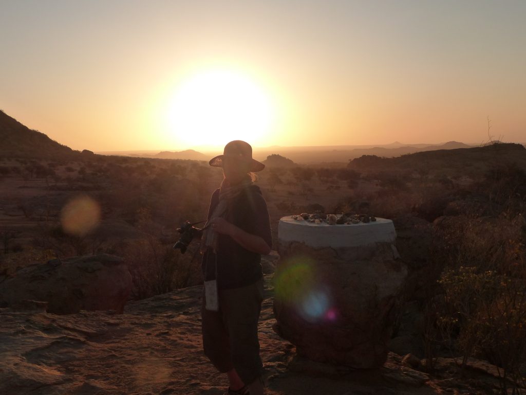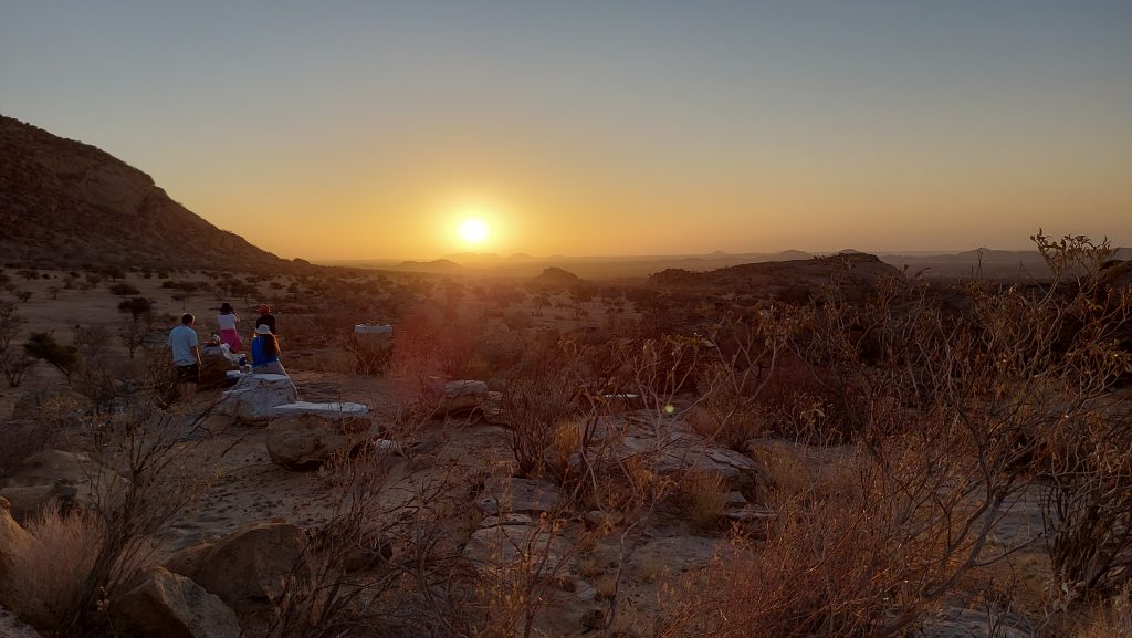 Dann ging es zum Sundowner Platz, der außerhalb der Lodge lag. Von hier oben haben wir einen wunderschönen Ausblick über die Ebene. Wir genießen unseren letzten Sonnenuntergang in der Wildnis. Danach sind wir nur noch in Windhoek.