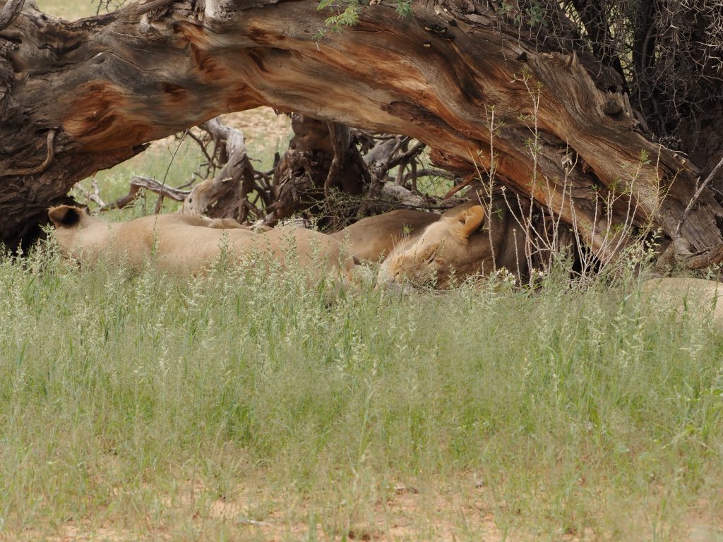 Am Picknick Platz Kamqua haben wir eine Pipipause gemacht. Ca. 500m nach dem Platz haben Autos angehalten und uns gezeigt, dass dort Löwen liegen. Wir wären mal wieder vorbei gefahren. Die Löwen lagen direkt unter den tiefhängenden Zweigen eines Baumes. Man muss echt überall hinschauen.