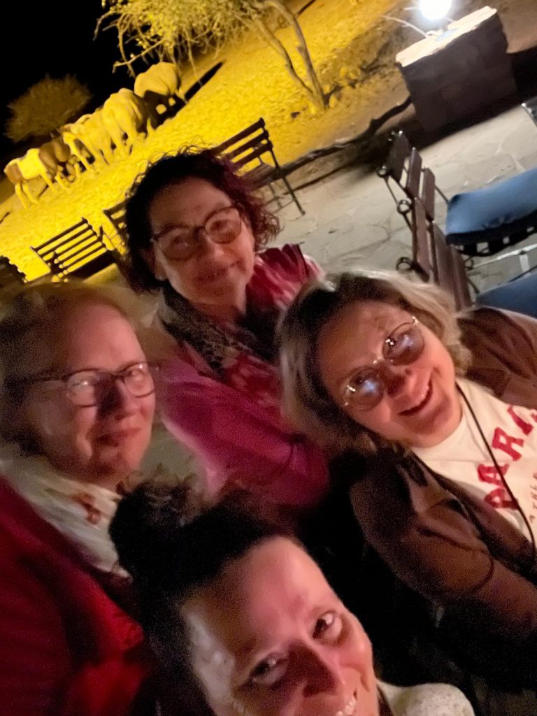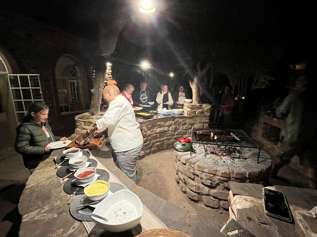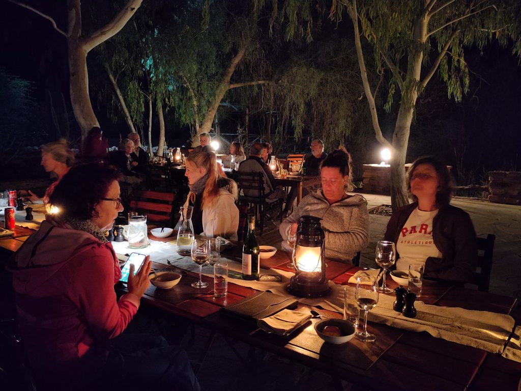 Zum Abendessen haben wir draußen, zusammen mit anderen Gästen an einem langen Tisch gesessen. Es wurde gegrillt (afrikanisch Braai). Es gab Oryx und Giraffe. Dazu verschiedene Beilagen.