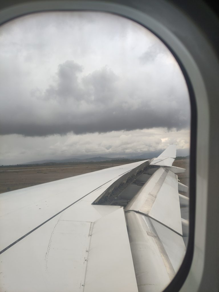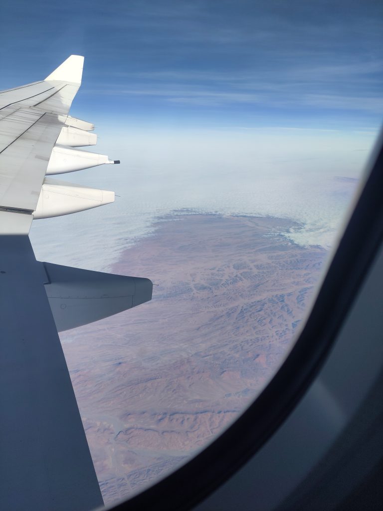 Wir sind gestern Abend relativ pünktlich in Frankfurt los geflogen. Beim Check-in konnten wir noch die Plätze tauschen, sodass wir nebeneinander sitzen konnten. Dafür schauten wir aber auf die Tragfläche. Okay, man kann nicht alles haben. Über Namibia gab es viele Wolken, aber eine Wolkendecke hat uns einen Blick auf die Dünen beschert.