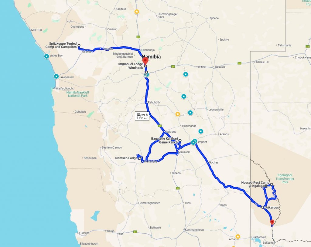 Alle Unterkünfte in Namibia habe ich wieder über Aileen von Namibia Adventures buchen lassen. Hier ist nun unsere Route.