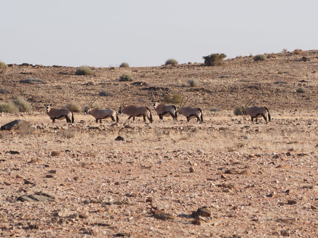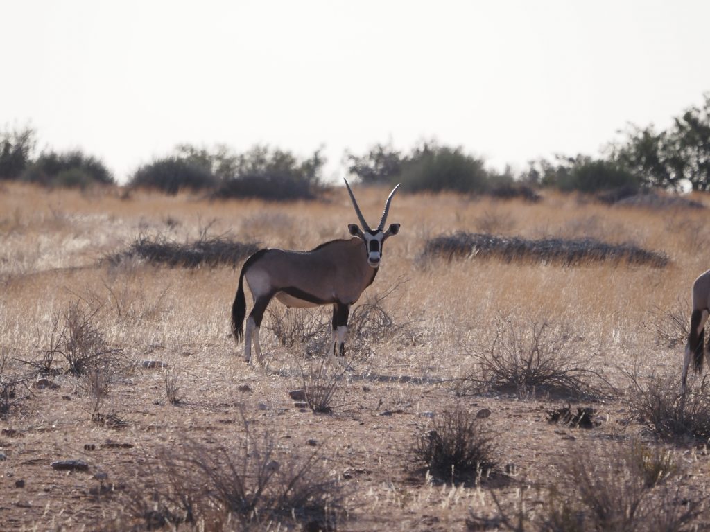 Gleich am ersten Abend machten wir eine Sundowner Fahrt. Leider gibt es auch hier wegen der Trockenheit nicht so viele Tiere. Trotzdem haben wir einiges entdeckt. Oryx sieht man recht viele. Außerdem gab es noch einen Löffelhund, leider ohne Foto und ein paar vereinzelte Antilopen.
