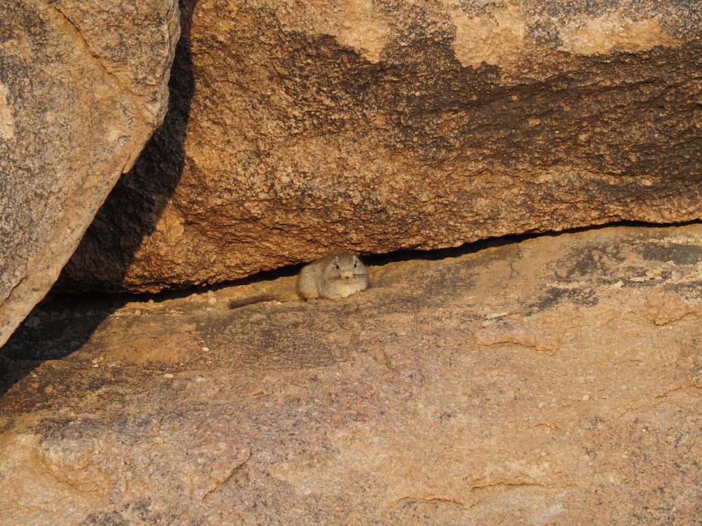 Tiere gab es fast keine. Aber auch kleine Tiere sind interessant, hier zum Beispiel eine Felsenratte, die unseren Sundowner genau beobachtet hat.