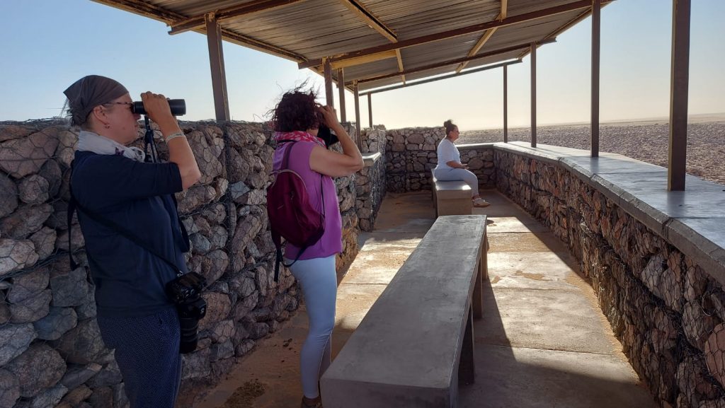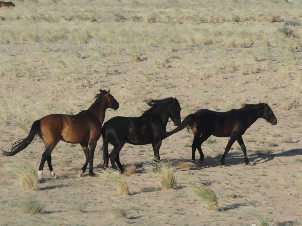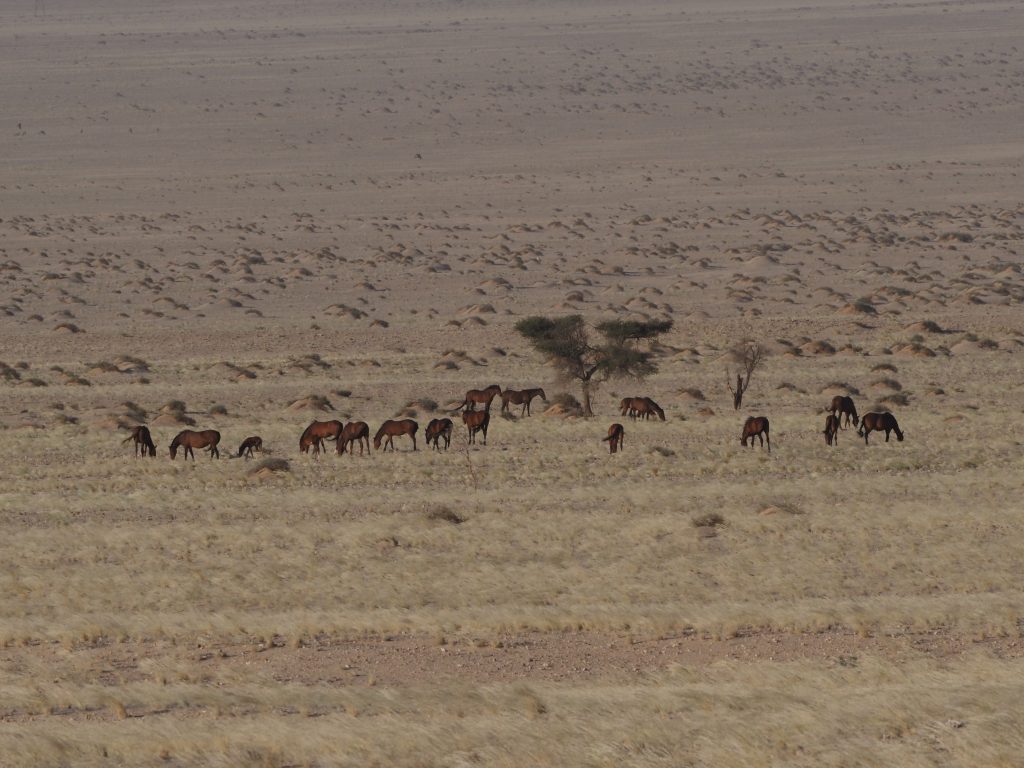 Deshalb dachten wir uns, wir nutzen jede Möglichkeit. Also sind wir vor dem Abendessen nochmal ein paar Kilometer Richtung Garub gefahren. Etwas entfernt von der Straße haben wir dann schon einige Pferde gesehen.