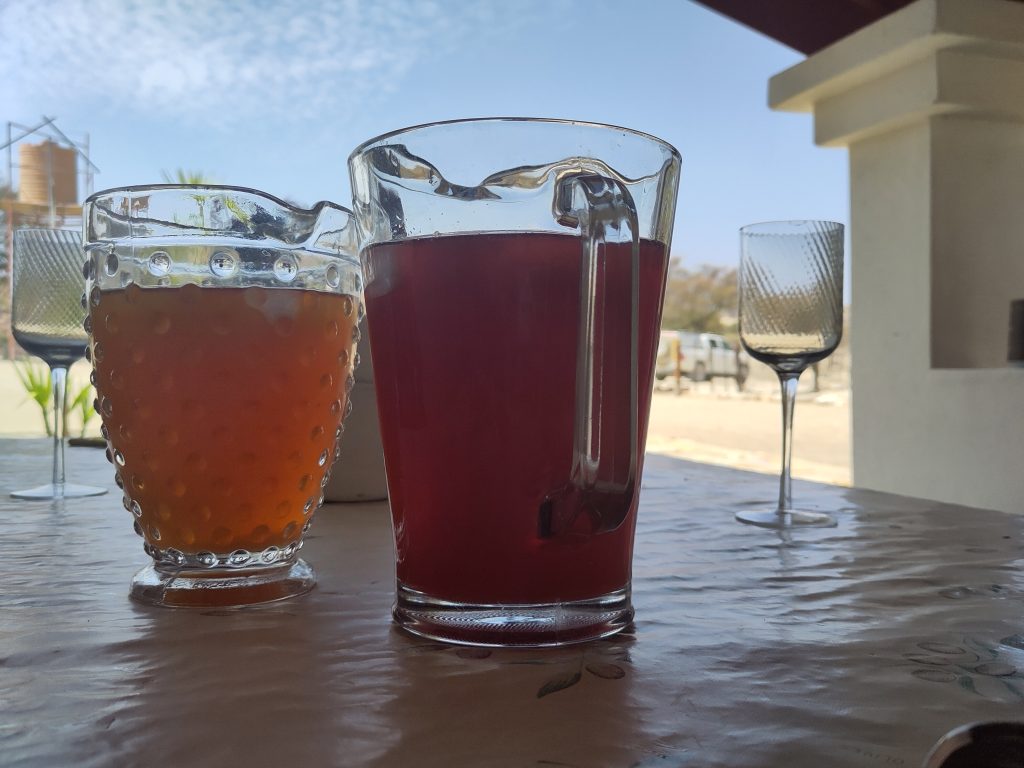 Zuerst haben uns zwei Hunde sehr freundlich begrüßt. Von den Farmern aber keine Spur. Es dauerte echt einige Minuten bis Donavan und seine Frau Lorette aufgetaucht sind. Sie haben uns mit einer lekkeren hausgemachten Limonade und interessanten Infos zum Farmen in Namibia versorgt.