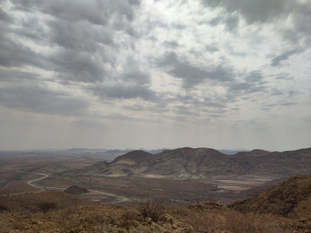 Danach ging es weiter zum nächsten Pass, der Spreetshoogte Pass. Dies ist der zweitsteilste Pass in Namibia mit 22% Steigung und einer Passhöhe von 1676m. Hier hat man bei klarem Wetter ein Wahnsinnsaussicht. Durch die Trockenheit liegt im Moment sehr viel Staub in der Luft. Trotzdem war die Aussicht nicht schlecht.