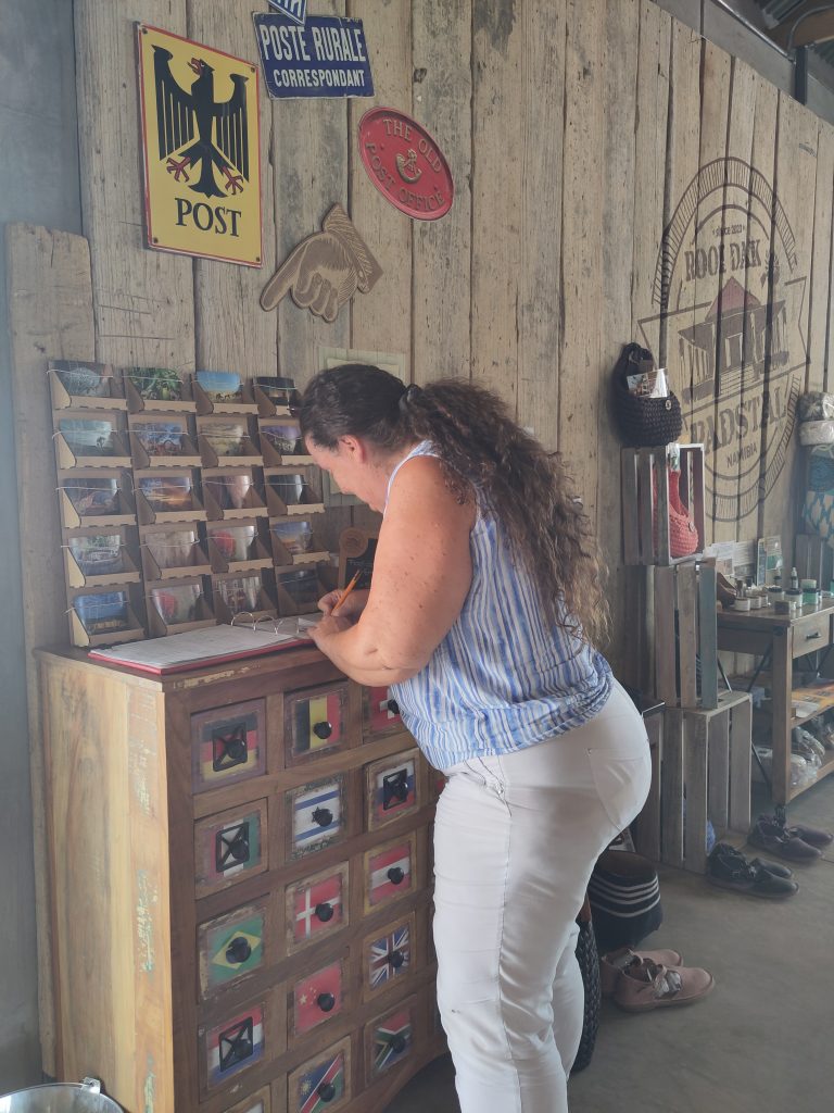 Bei dem Postamt kann man gegen ein kleines Entgelt eine Karte schreiben, diese mit Namen und Ort adressieren und je nach Land in die entsprechende Schublade legen. Dem Empfänger teilt man die Koordinaten mit und wenn derjenige in Namibia ist und hier vorbei kommt, kann er seine Post entgegen nehmen. Tolle Idee!